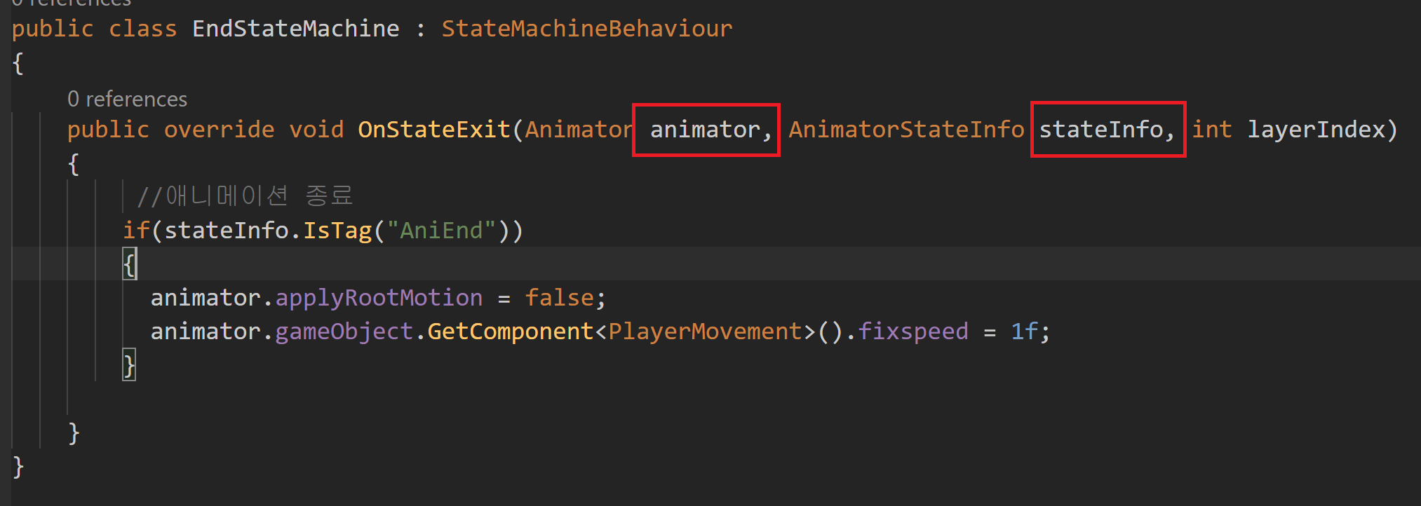 stateinfo.IsTag 을 이용하여 현재 애니메이션이 맞는지 아닌지 확인 할 수 있다.