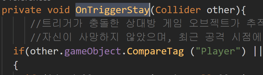 Play시 어느정도 시간이 지나면 프레임 저하와 뚝뚝 끊기는 렉 (병목) 현상이 발생함을 감지 하였고, 이와 같은 문제를 찾는 과정에서 OnTriggerStay의 other.gameObject.Tag = "Player" 이 부분인 문제가 됨을 감지하였다. 이 방법은 느리고 쓰레기를 많이 생성한다고 한다.