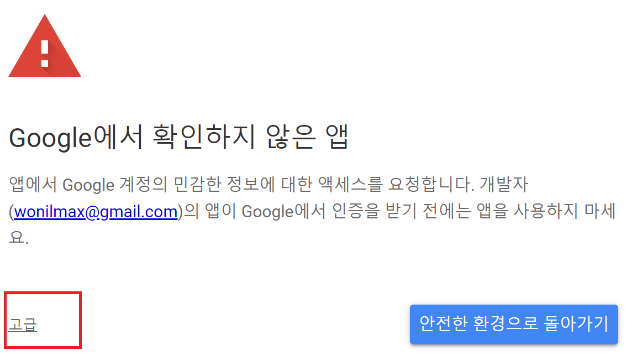 게시(publish) > 웹앱으로 배포 > 구글에서 확인하지 않은앱 경고창이 뜨면