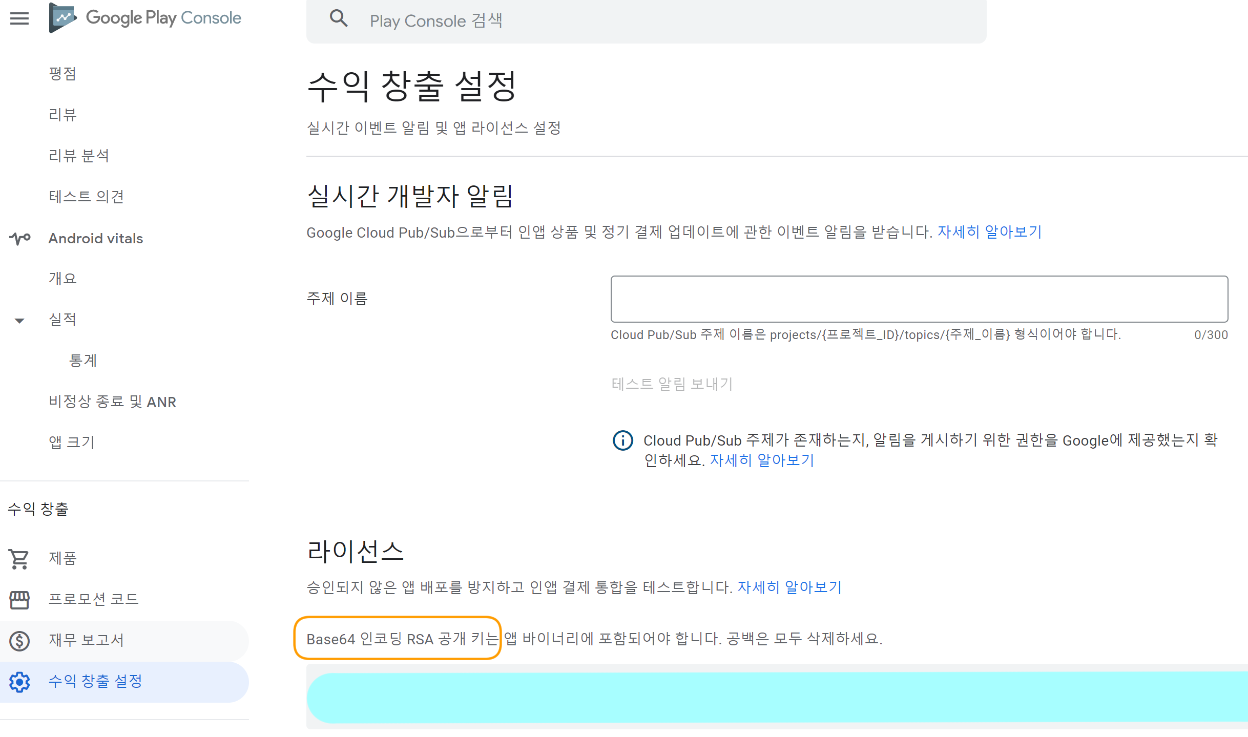 구글 플레이 콘솔이 업데이트 되고 난 후 라이선스 키의 위치
