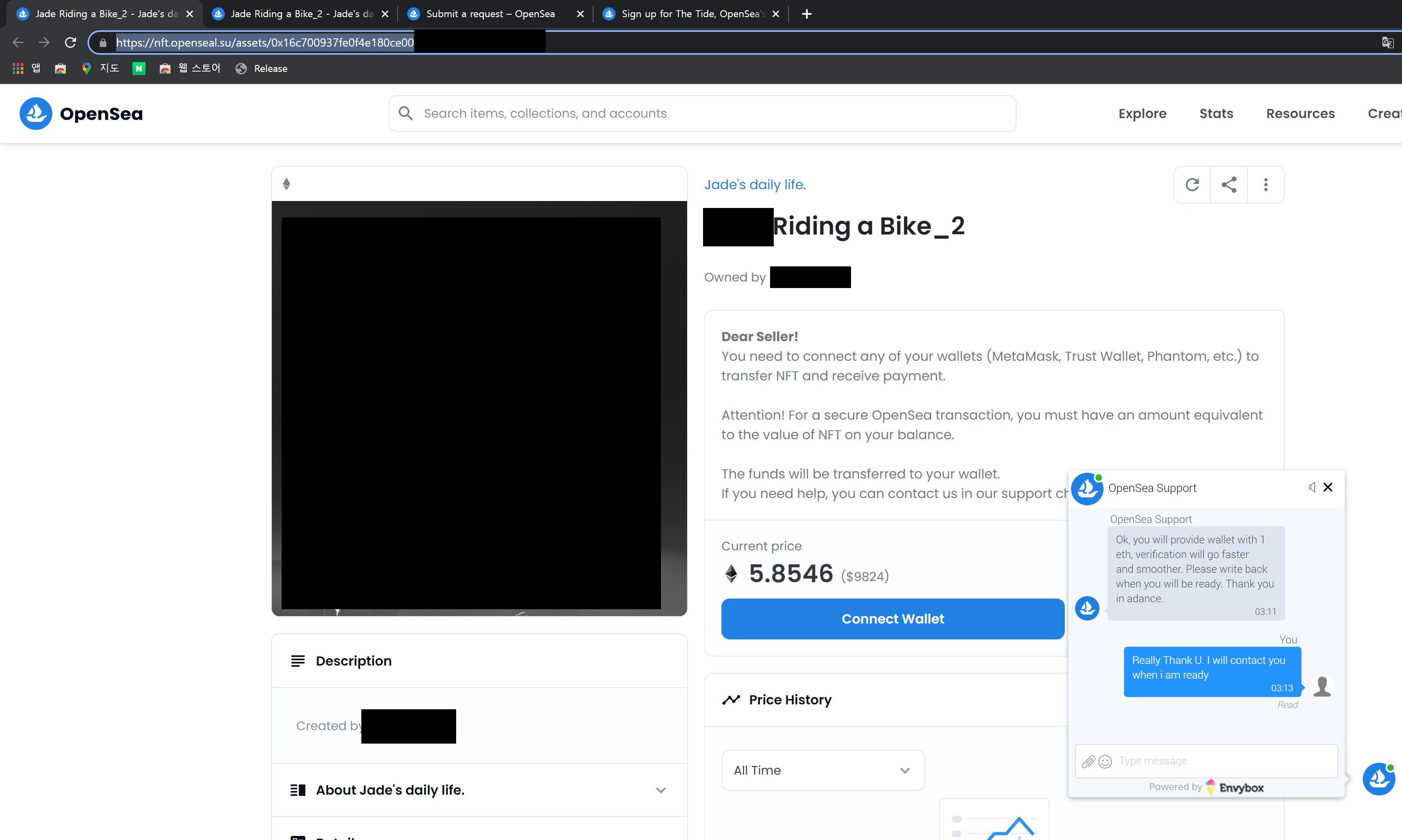 저 QR코드를 스캔하게 되면, 다음 사이트로 이동하게 되는데, 이때 절때 Metamask 주소를 연결하면 안된다. 이곳은 Opensea와 비슷하게 꾸민 피싱사이트이다. 알아보는 방법으로는, 인터넷 주소창을 보면, Opensea.io가 아닌 nft.openseal.su 라고 뜨는 것이 보인다. opensea가 아닌 openseal 인 것이다.