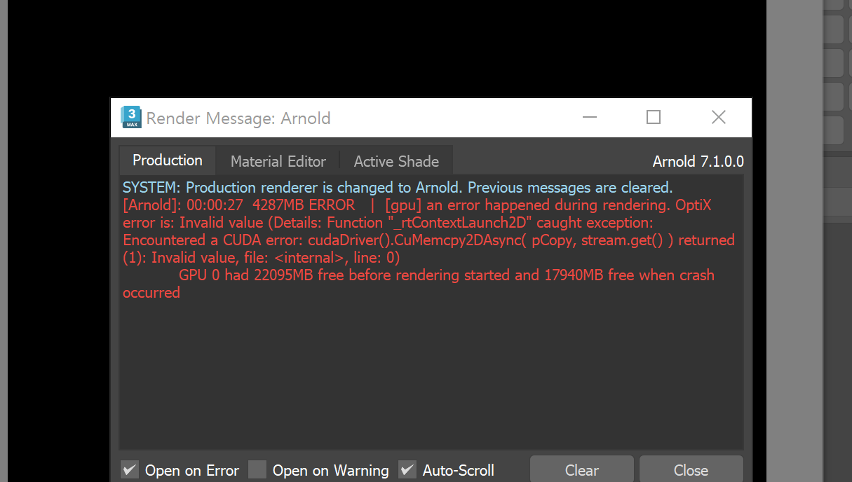 랜더링을 하다보면 다음과 같은 메세지가 뜨면서 소프트웨어가 강제종료 되는 현상이 있다.