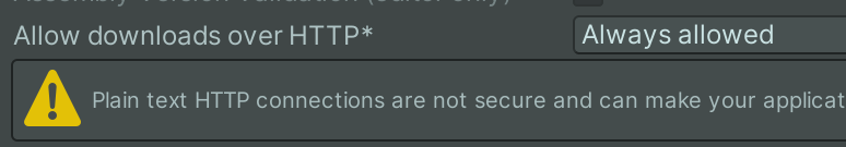아래와 같은 오류 발생 > 해결 방법 > Player Setting > Player > HTTP를 Always allowed로 전환하면 오류 메세지 사라짐.
