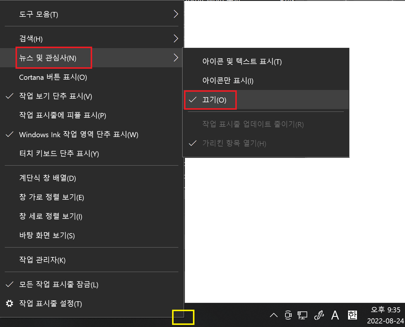 >> 윈도우 아래 Bar(노란색 박스) 마우스 오른쪽 클릭 > 뉴스 및 관심사 > 끄기.
