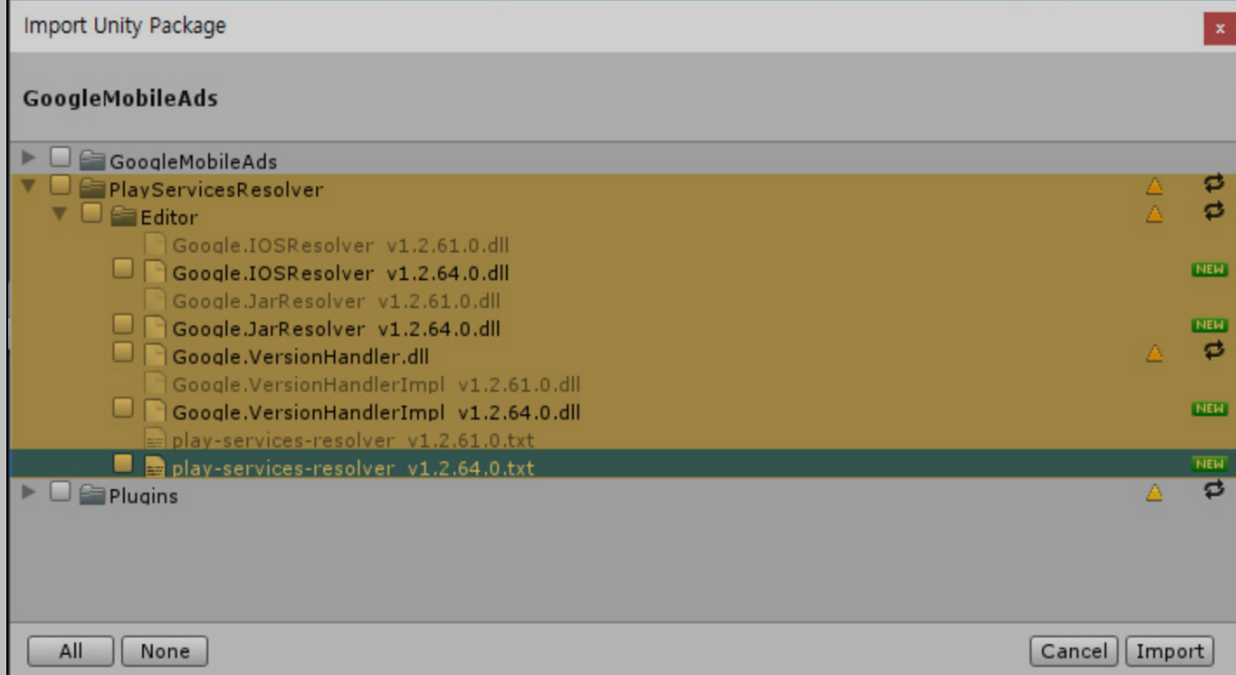 1. PlayServiceResolver의 버전 문제로 여러 Admob, Firebase, GPGS 등 이 충돌 및 빌드 에러가 발생하는 듯하다. 아래그림과 같이 한쪽을 import 했을시 자동으로 중복을 제거하지만 그렇게 한다고 해도 에러는 발생한다.