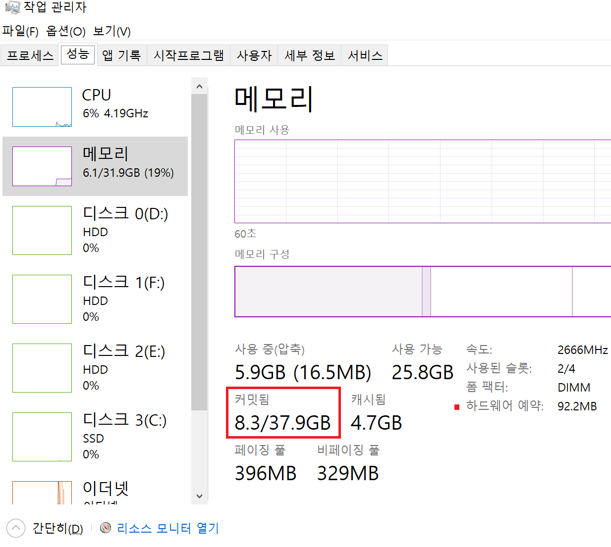 가장 중요한 부분은 아래 그림을 보면 커밋됨이다. 부모가 되는 37.9GB는 가상메모리 + 나의 메모리를 합한 값이다. 분자 8.3GB가 부모를 초과하게 되면 사용중인 프로그램을 윈도우가 강제 종료 시켜버린다. Unity 3D, 3ds max 등이 강제종료 되는 현상은 렌더링이나 과한 플러그인을 사용시에 메모리가 부족하면 강제종료 되는 현상이 빈번히 일어난다. 이때 작업관리자를 켜놓고 커밋의 분자가 부모를 초과하는 순간 강제종료 되는 현상을 확인 할 수 있다.