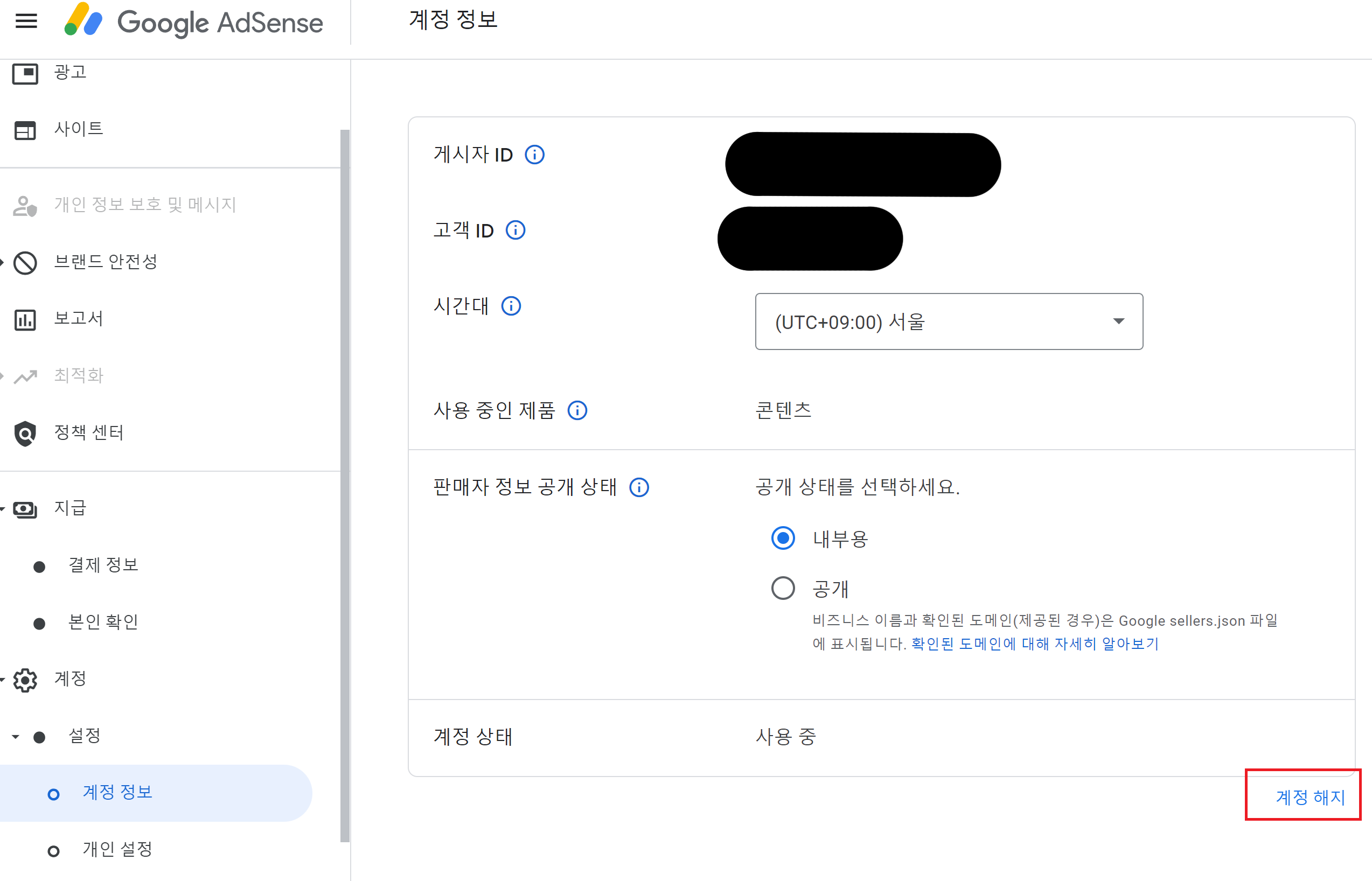 에드센스> 계정 > 설정 >계정정보 >계정해지