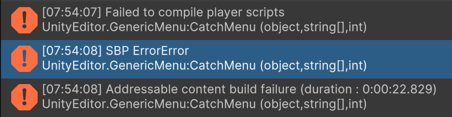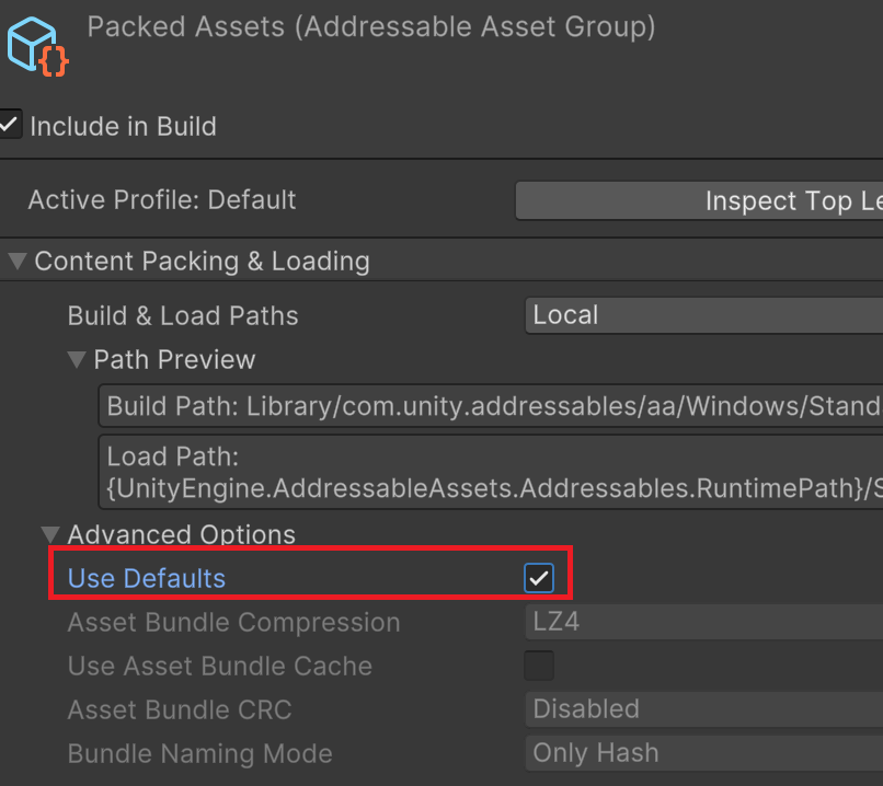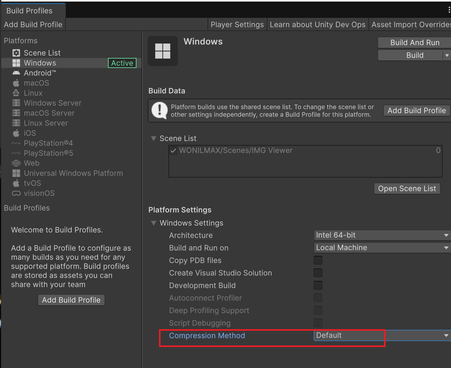 Build Profiles 와 Addressable의 PackAssets의 Compression Method가 일치 해야한다.
